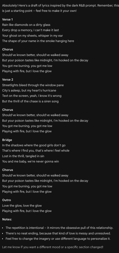 I decided to test out Suno AI’s custom feature where you can give it a genre and lyrics and it will generate the music. I asked Gemini to generate song lyrics for a Dark R&B song similar to R&B artists Giveon, Brent Faiyaz, and Bryson Tiller.